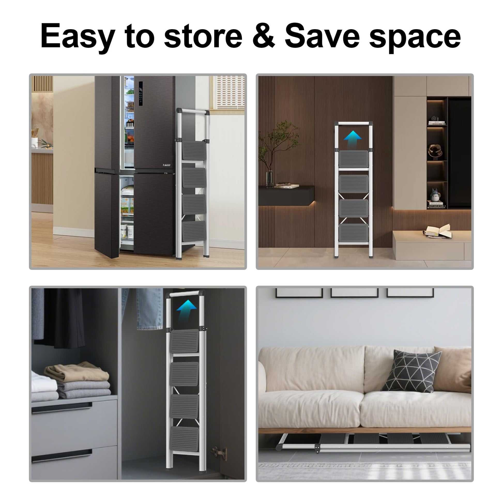 - Compact and Portable: This folding step stool collapses to just 3 inches in thickness, making it easy to store in tight spaces such as against walls, in corners, under beds, or in closets. Crafted from high-quality lightweight steel, it’s effortless to carry with just one hand, making it both practical and versatile.