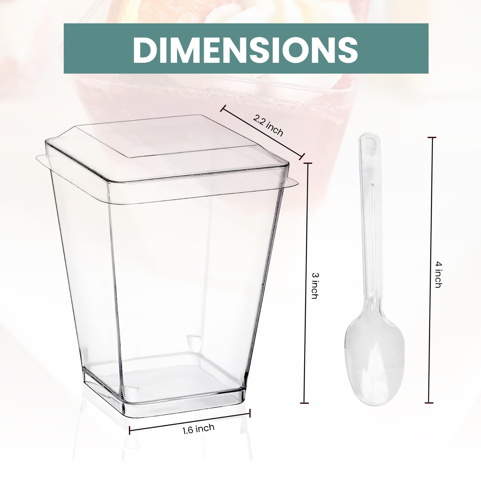- π¦ PACKAGE INCLUDES: Our 5 oz set of dessert cups includes 50 clear plastic dessert cups, 50 plastic spoons and 50 plastic lids . capacity: 5 oz, cup height: 3in, cup top length: 2.2in, cup bottom length: 1.6in, easily meet most of your daily needs.